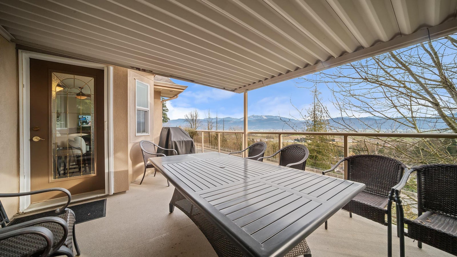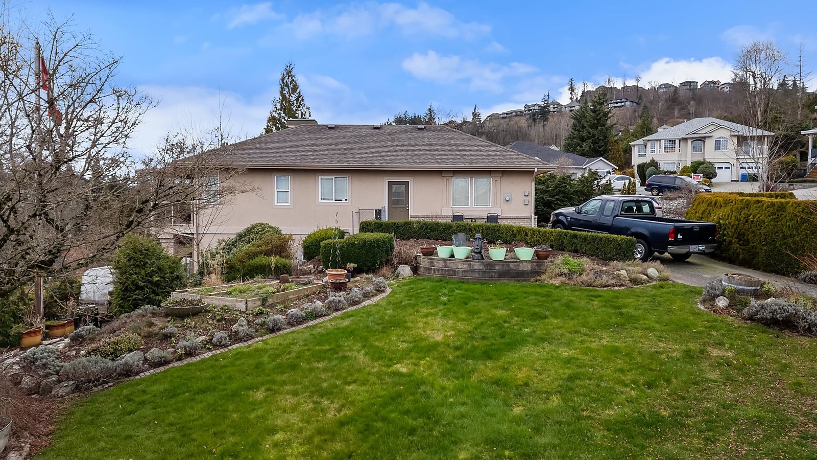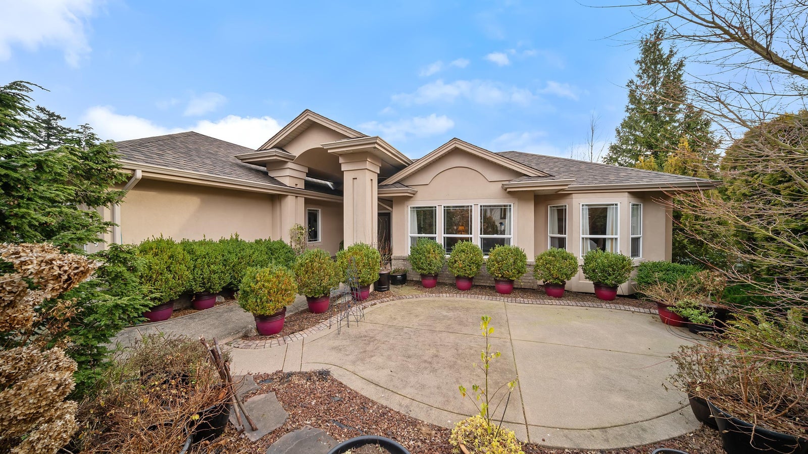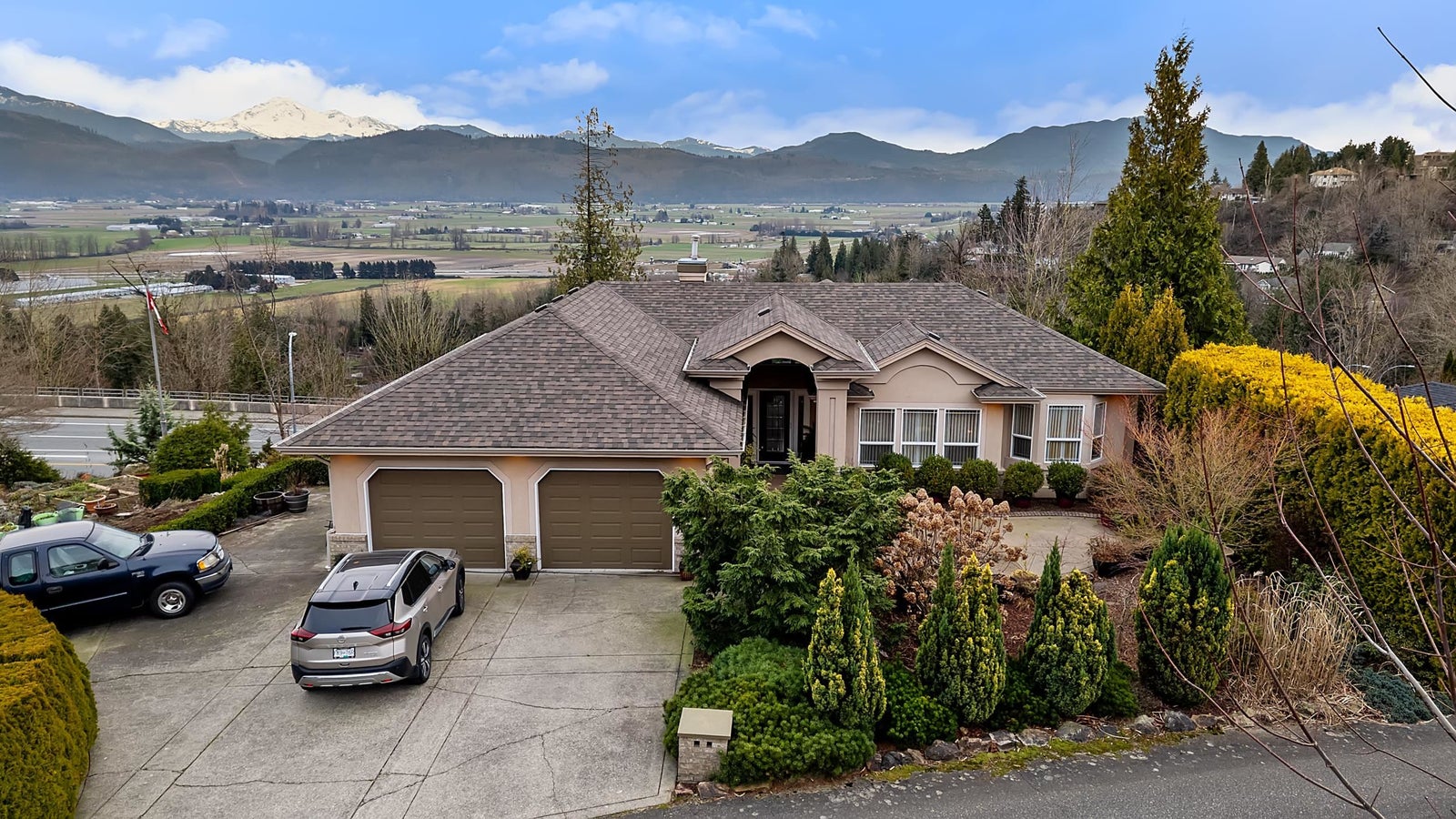 Stunning panoramic Mt. Baker views define this custom 6-bedroom rancher with full basement, ideally located on a 1/3-acre lot in desirable East Abbotsford. Nearly every window captures breathtaking scenery. The home features a cherry wood kitchen with pantry and double wall ovens, dark maple hardwood flooring, crown mouldings, decorative columns, and 9-foot ceilings throughout. The fully finished walk out basement offers a rec room with full bar and pool table area, plus separate entry with suite potential. The primary bedroom on the main floor features ensuite including a custom double vanity with dressing area. Plenty of recent updates—roof, furnace, and air conditioning—provide peace of mind. An exceptional view property offering space, quality, and lifestyle. Call today!