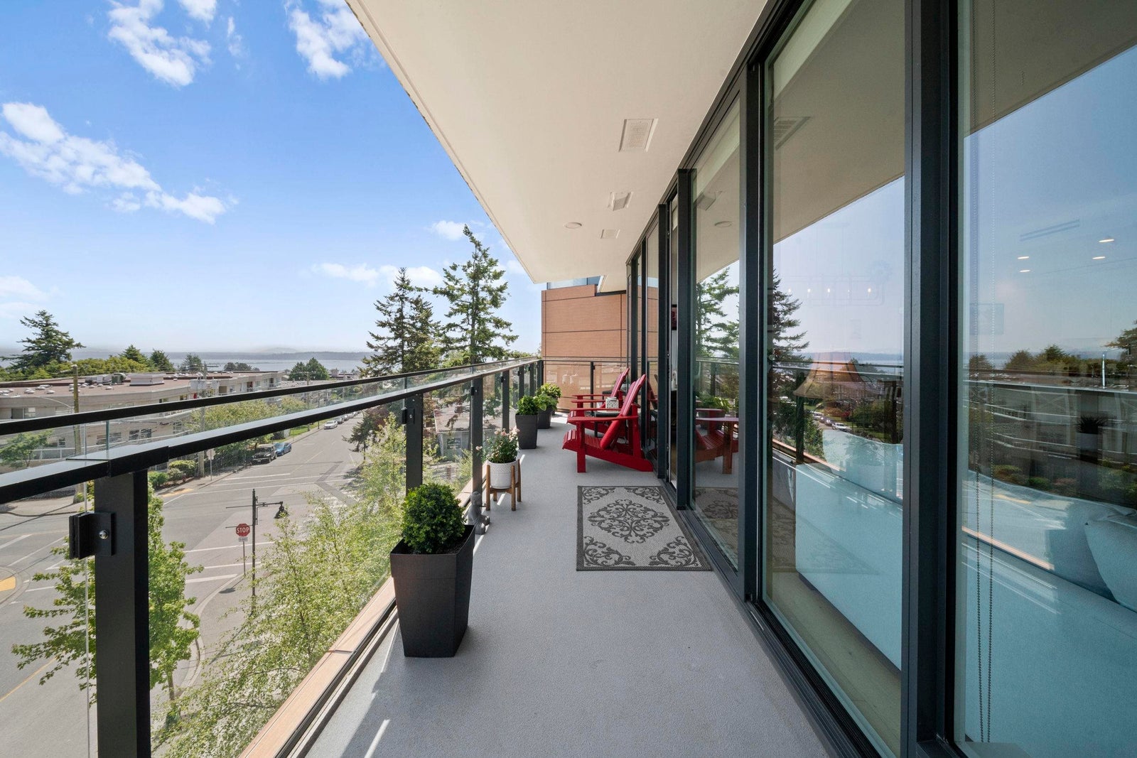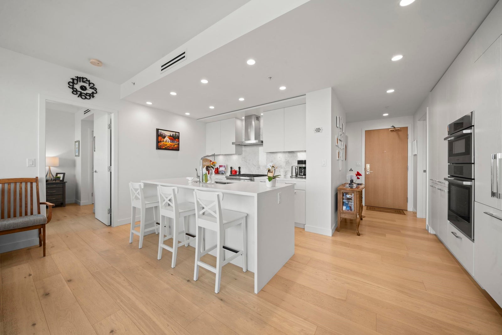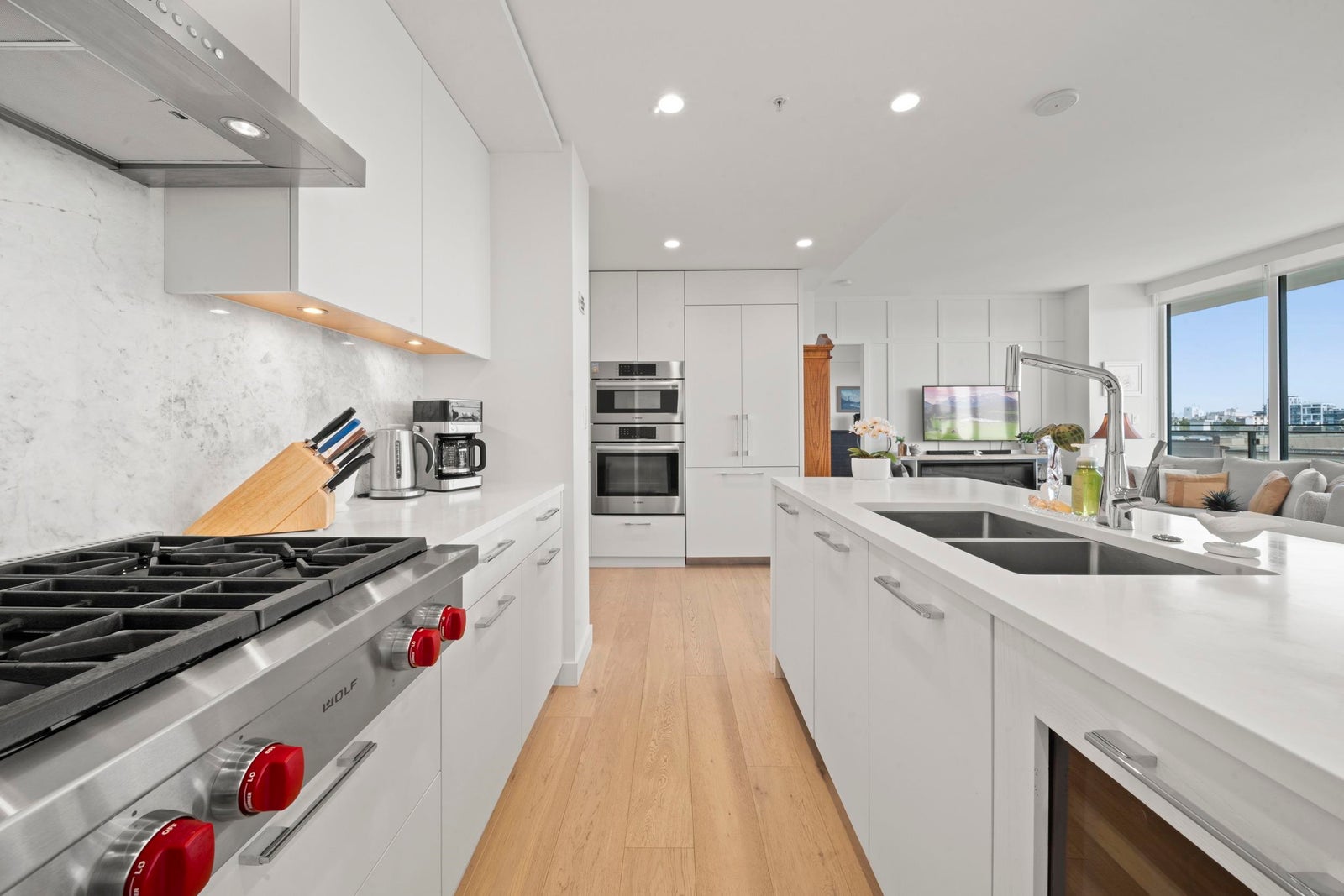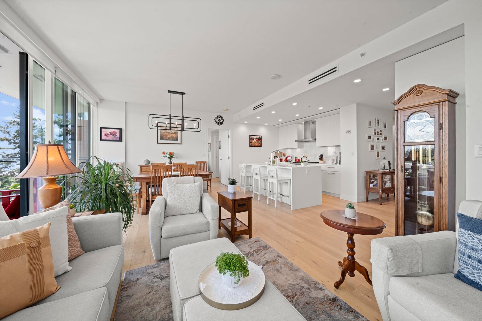 Experience refined coastal living in this stunning two-bedroom PLUS den, three-bathroom residence by Marcon. Enjoy sweeping Southeast, unobstructed views of Semiahmoo Bay, breathtaking sunrises, and Mount Baker vistas through expansive floor-to-ceiling windows. This beautifully appointed home features a Wolf gas range, Bosch appliances, built-in wine fridge, a large kitchen island, custom cabinetry, and elegant quartz countertops. Wide plank engineered hardwood floors throughout. A spacious in-suite storage room and side-by-side laundry with folding counter add everyday convenience. Both bedrooms offer spa-inspired ensuites with double vanities, floor-to-ceiling marble tile, primary incudes heated tile flooring. Ideally located just steps from shops, dining—luxury living at its finest.