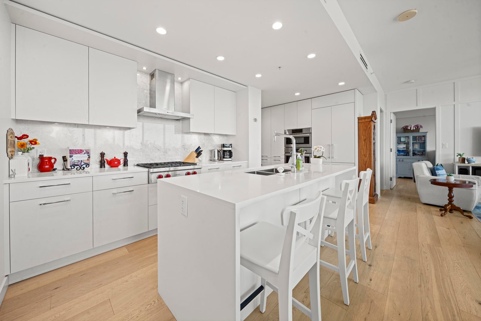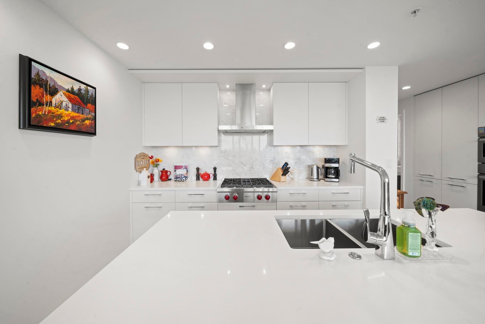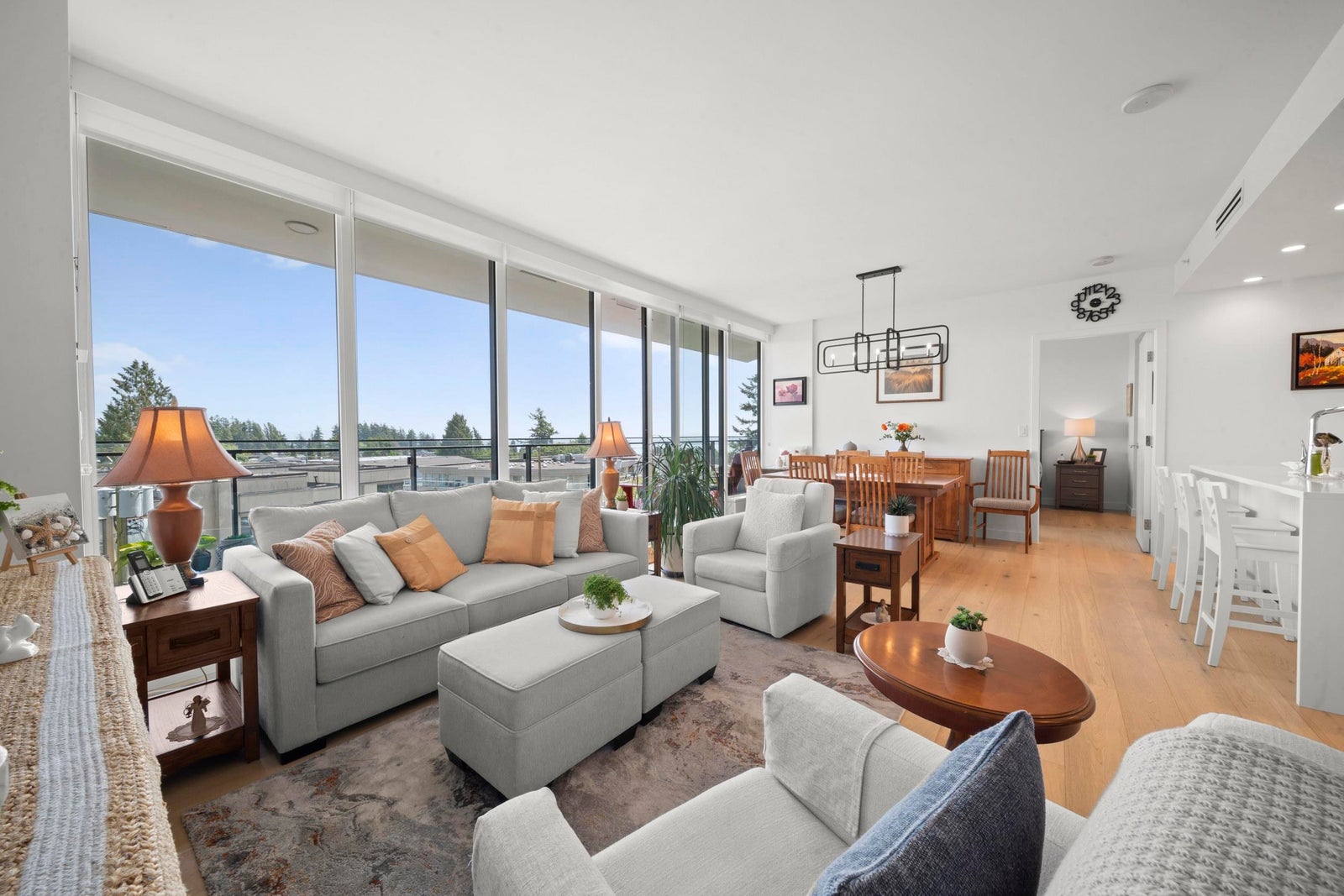Experience refined coastal living in this stunning two-bedroom PLUS den, three-bathroom residence by Marcon. Enjoy sweeping Southeast, unobstructed views of Semiahmoo Bay, breathtaking sunrises, and Mount Baker vistas through expansive floor-to-ceiling windows. This beautifully appointed home features a Wolf gas range, Bosch appliances, built-in wine fridge, a large kitchen island, custom cabinetry, and elegant quartz countertops. Wide plank engineered hardwood floors throughout. A spacious in-suite storage room and side-by-side laundry with folding counter add everyday convenience. Both bedrooms offer spa-inspired ensuites with double vanities, floor-to-ceiling marble tile, primary incudes heated tile flooring. Ideally located just steps from shops, dining—luxury living at its finest.
